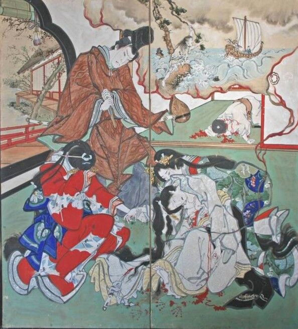 平家の栄華と没落を描いた「平家物語」を取材した作品は多く存在し、平清盛により追放された俊寛僧都をめぐる段が上演される「平家女護島」もその一つです。本展では、その作品を題材とした2点の芝居絵屏風を展示いたします。