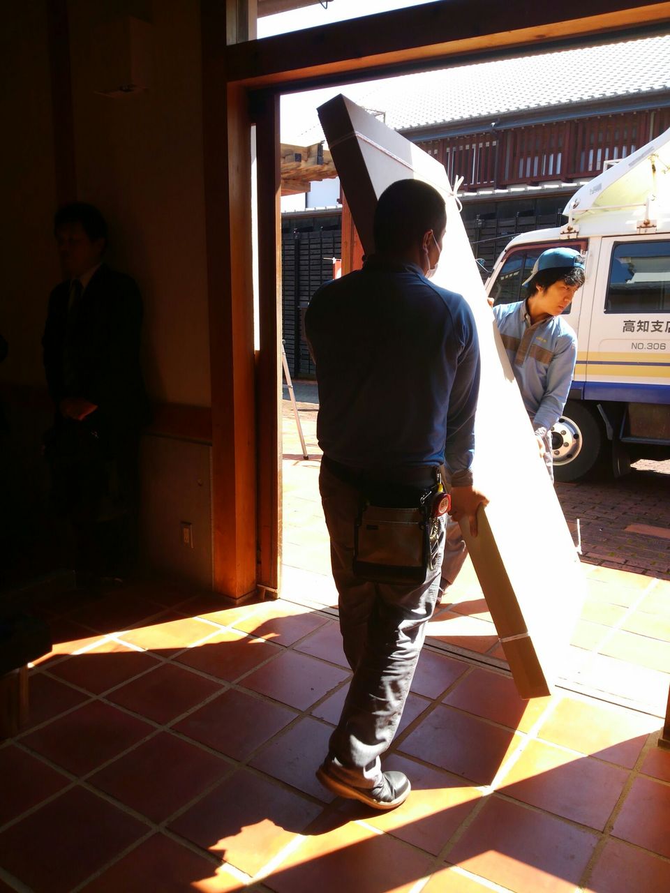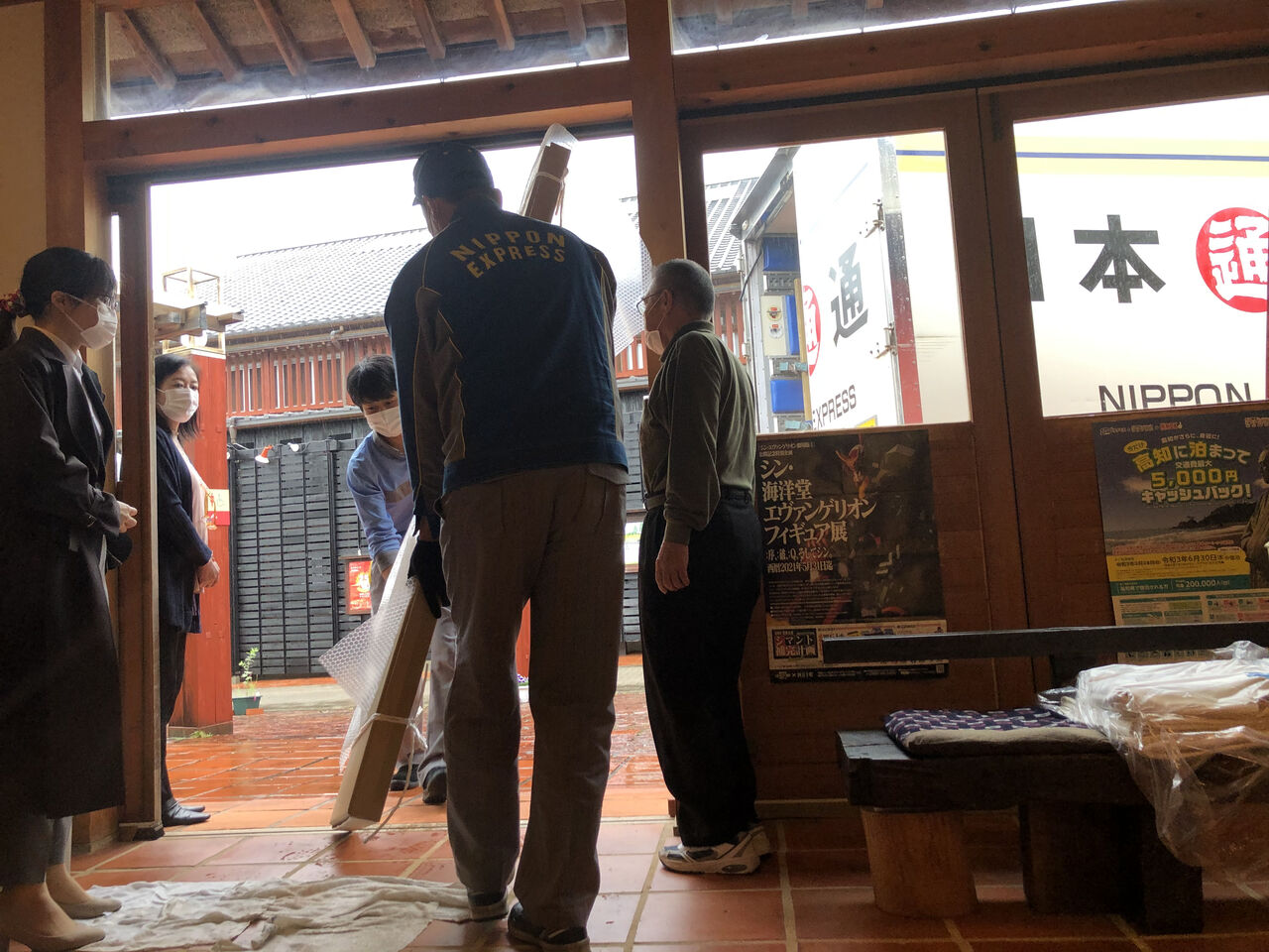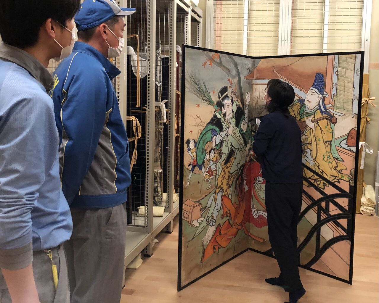 輸送のプロがすっと手際よく芝居絵屏風を包んでくれました